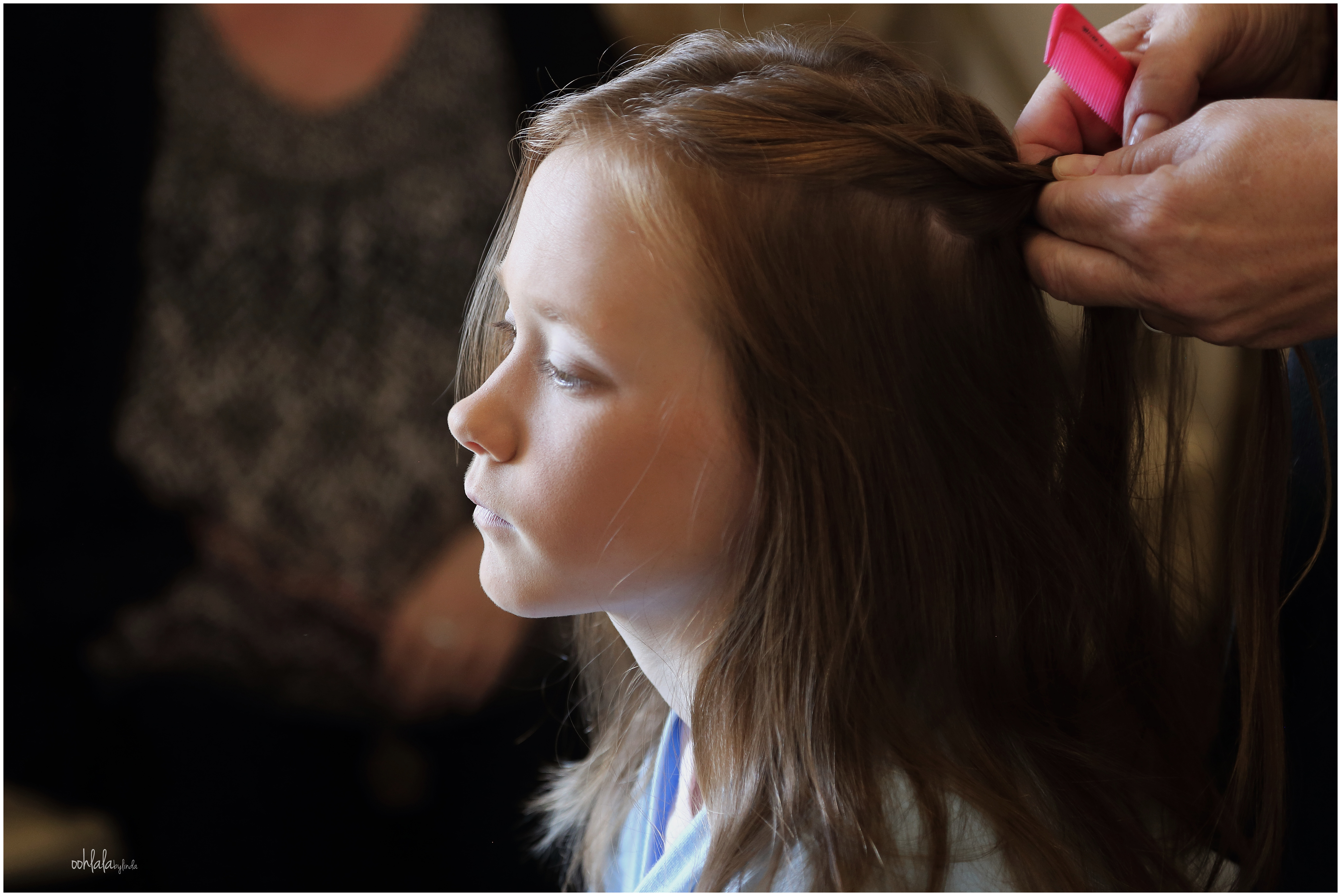 bridesmaid having her hair done during photography of bridal preparations