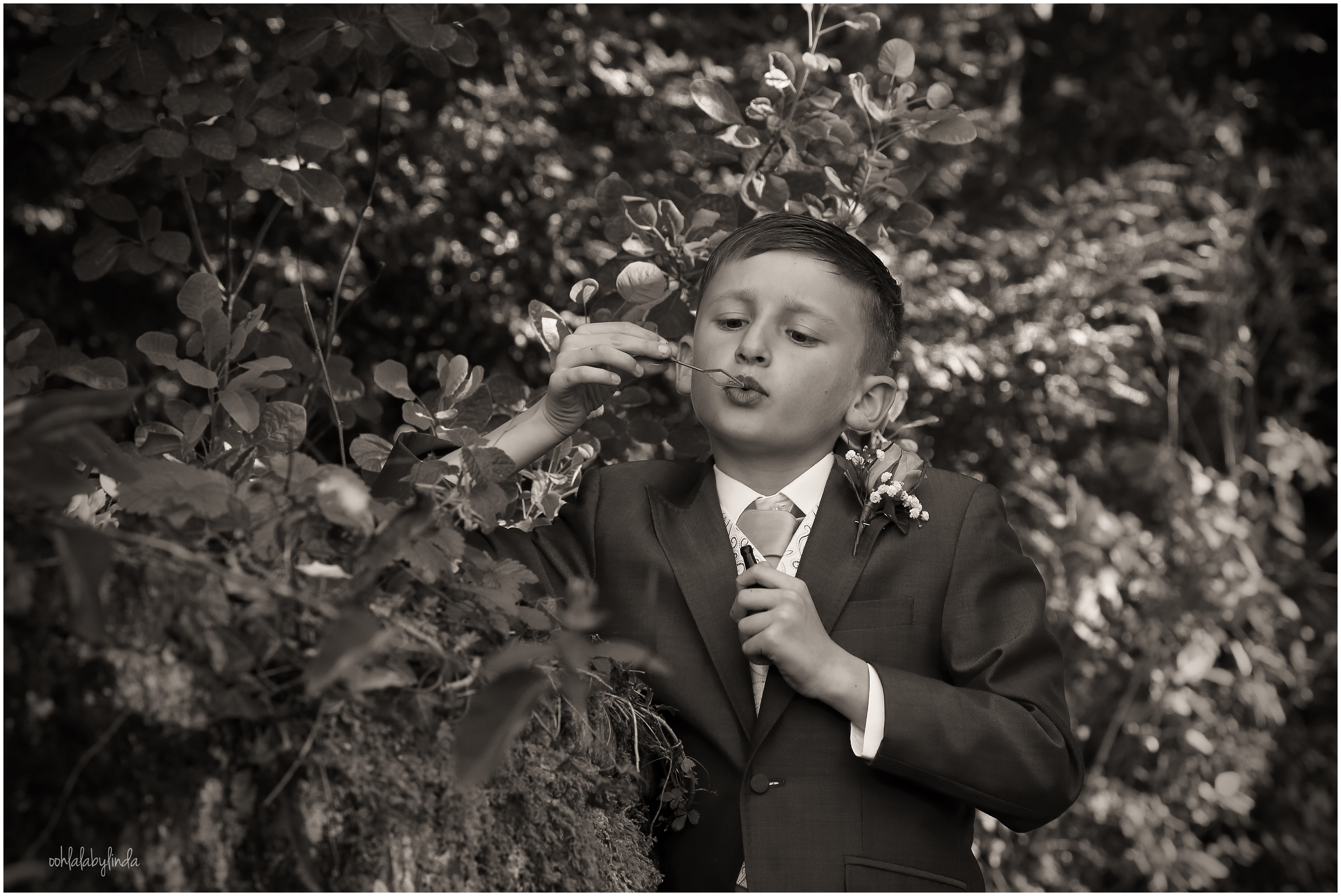 black and white portrait of page boy blowing bubbles at a Chepstow wedding