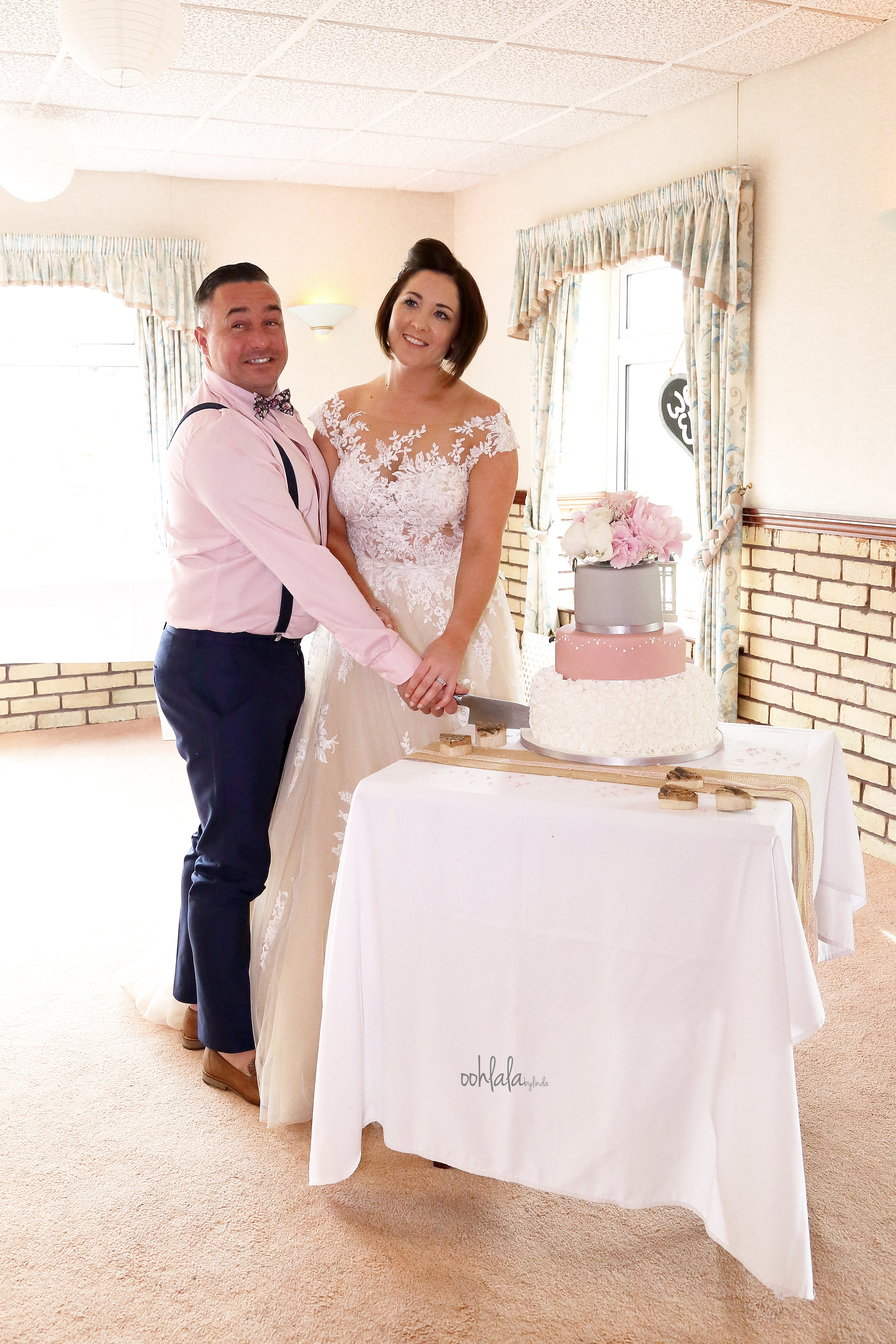 bride and groom cutting wedding cake