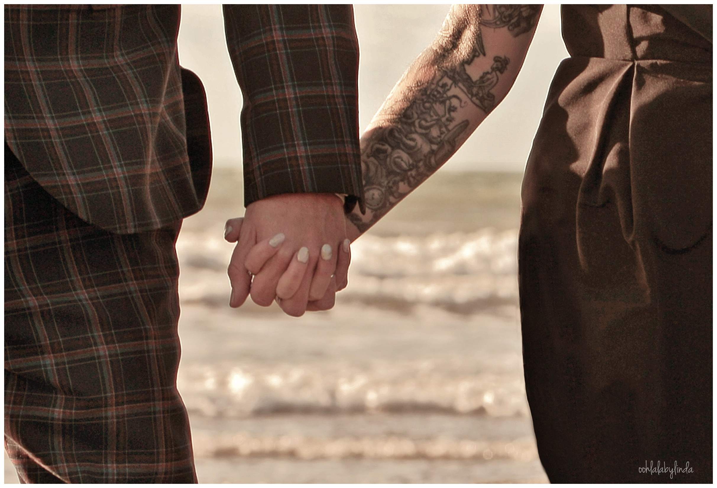 bride qand groom hold hands on the beach